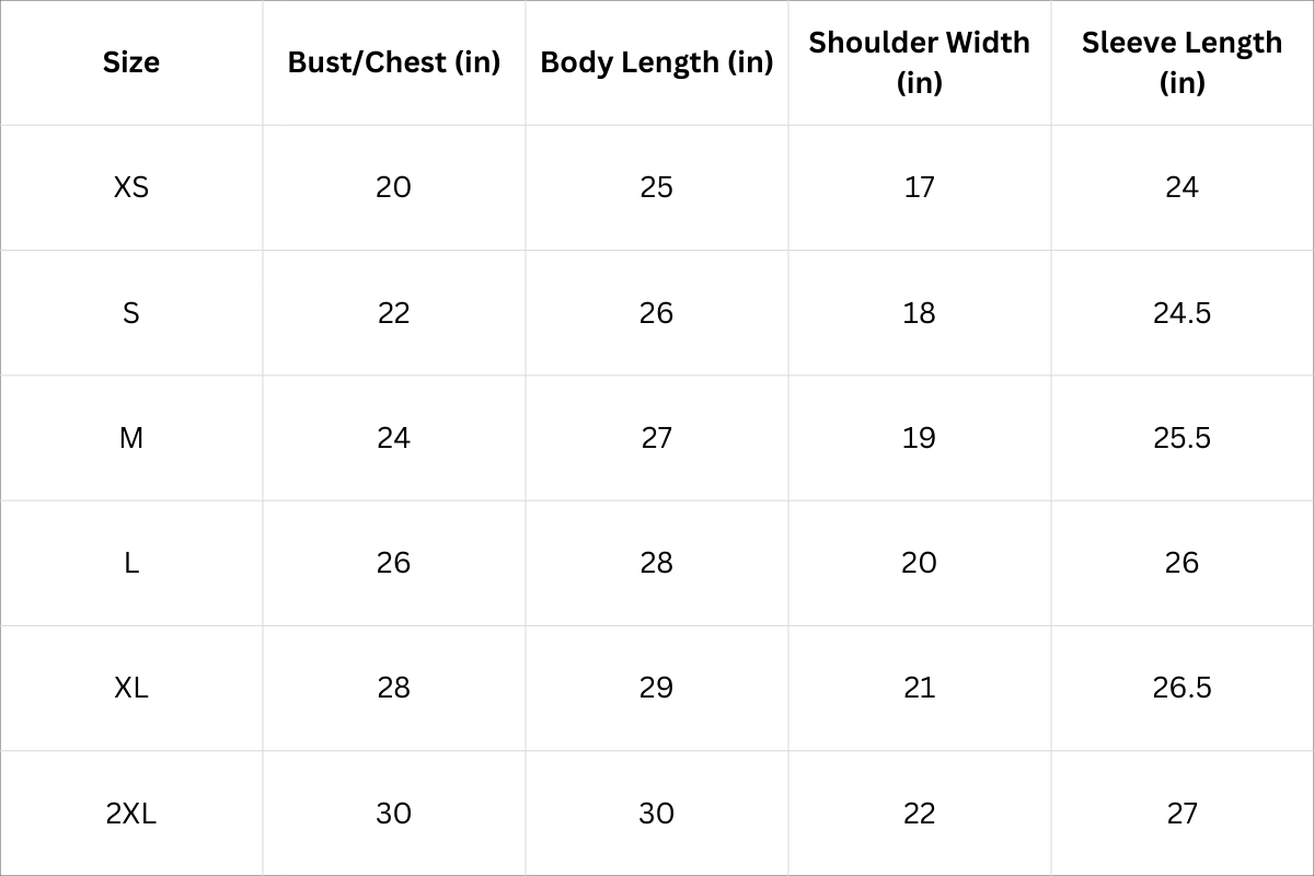 Size Chart (Inches):